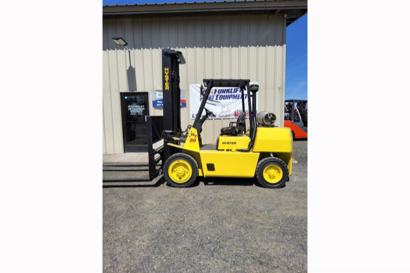 1996 Hyster H80XL – A sturdy 8,000 lb capacity propane-powered forklift featuring side-shifting fork positioners, a 169-inch standard mast, automatic transmission, 6-foot forks, and approximately 6,800 hours on the meter; recently serviced and ready for work.