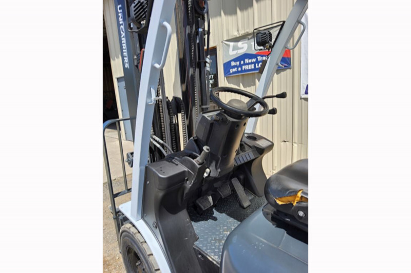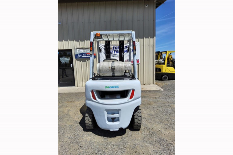 The 2018 UniCarriers MP1F2A25LV is a 5,000 lb capacity, LPG (liquefied petroleum gas) powered, pneumatic tire forklift. It's a 4-wheel, sit-down model designed for indoor and warehouse use. Key features include a 3-stage mast, dual auxiliary hydraulics, a side shifter with fork positioner, and 48-inch forks.