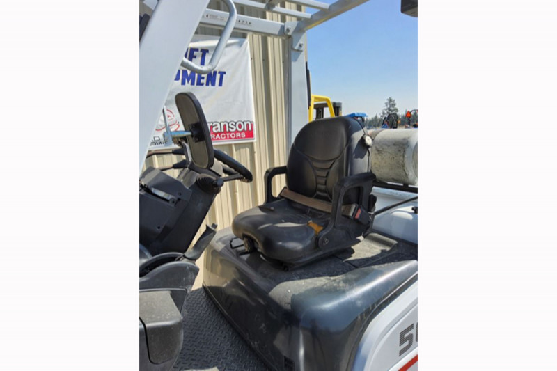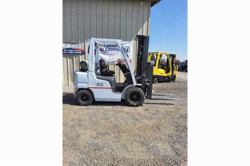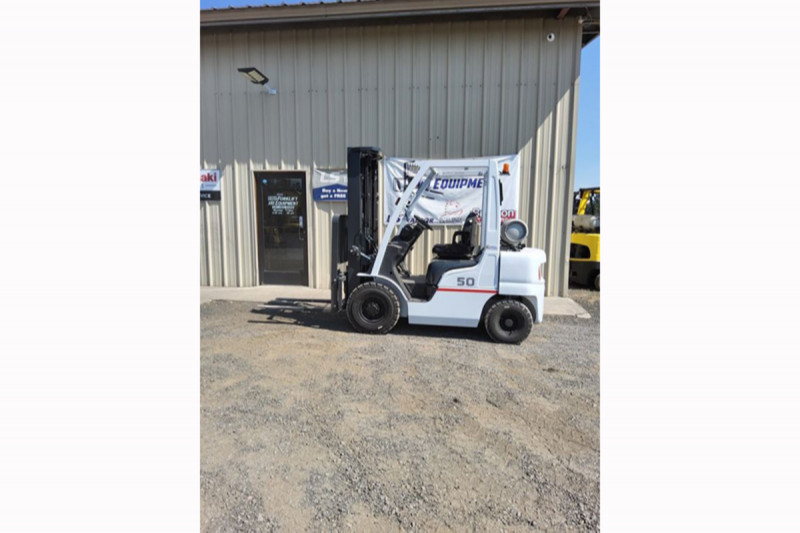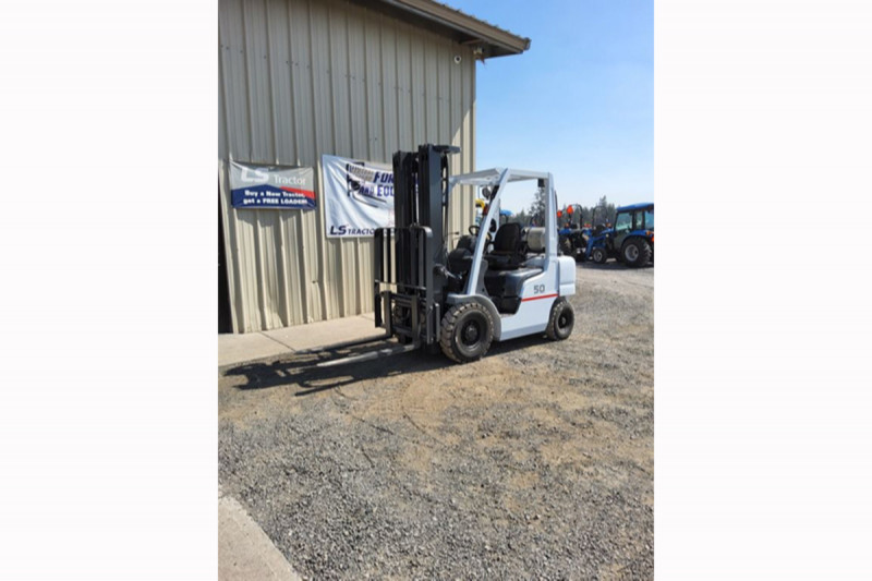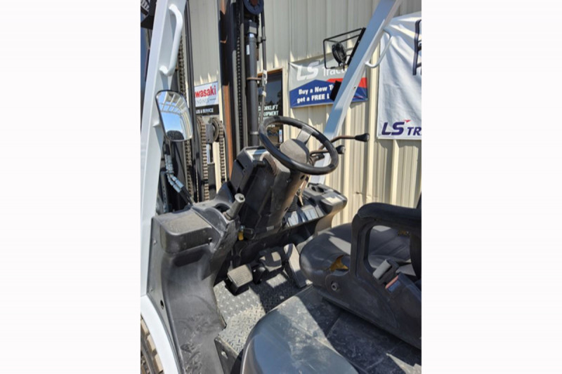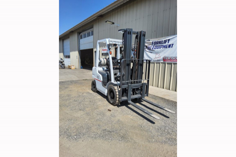 The 2018 UniCarrier MP1F2A25LV is a 5,000 lb capacity, LPG (liquefied petroleum gas) powered, pneumatic tire forklift. It's a 4-wheel, sit-down model designed for indoor and warehouse use. Key features include a 3-stage mast, dual auxiliary hydraulics, a side shifter with fork positioner, and 48-inch forks.